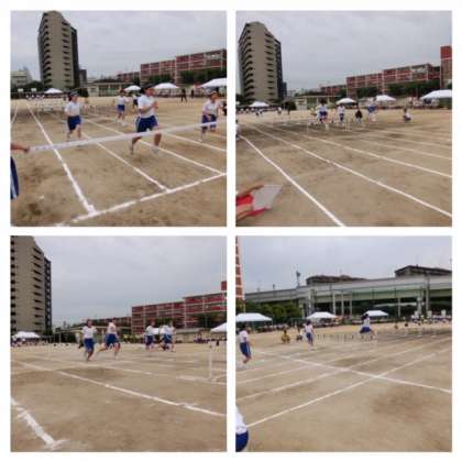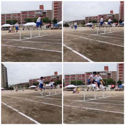 第1ハードルに向けてダッシュ。脚を振り上げて振り抜く。第2ハードルに向けてダッシュ。上手く跳び抜ける人、ハードルを倒してしまう人。最後まで気持ちも力も緩めるな。あきらめない。頑張れ。