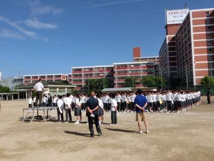 晴れわたる青空の下、朝の全校集会をおこないました。青の色が夏空に感じます。6月に入り、いよいよ夏の到来です。今週末には近畿地方も梅雨入りが近いかもしれません。