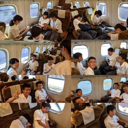 カードゲームを楽しむ生徒もいれば、寝ている生徒も色々です。姫路を過ぎたので、みんなおやつを食べ始めるかな。