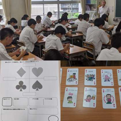 本日、7月2日(火)1限〜4限の時間帯で、クラスごとに講師を招いてトランプセミナーをおこないました。SP(サブパーソナリティ)トランプを使っての授業です。まず、52枚のトランプの中から、これは自分のことだなと思うものを10枚選びます。その選んだカードの枚数や数字の大きさによって、自分がどのような傾向の性格なのかがわかっていきます。また、その性格の特徴を活かして、目標の設定方法と効果的な学習スタイルやスランプの脱出方法などをわかりやすく説明されていました。進路に向けて「身体を大切に!主体的に!」という言葉もありました。進路に向けてのよいアドバイスになったと思います。