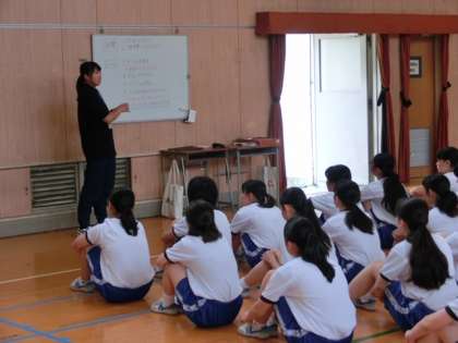 昨日につづき、7月3日(水)4限、3年1組2組の女子体育で、教育実習生の研究授業がおこなわれました。いくぶん緊張しているようすはうかがわれますが、明瞭な説明と声かけで授業を進めることができています。