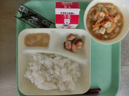 ■「いただきます」 今日の献立は、ごはん・鮭のつけ焼き・とうがんの煮物・みそ汁・焼きのり・牛乳です。いつもそうなのですが、味つけはほどよくやさしく美味しいです。今日のとうがんのように、あまり家庭で食卓にのぼらないであろう食材の味わいを知ることができるのも給食のよいところです。