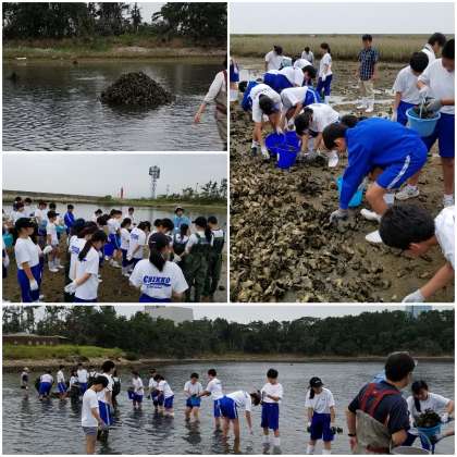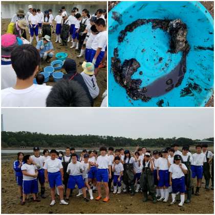 南港野鳥園の人工干潟は渡り鳥の飛来地として世界的にも重要な場所で毎年たくさんの野鳥が餌場として利用しています。しかし、現在干潟では牡蠣が自然発生して干潟を覆いつくしています。そこで、今回八阪中学校と築港中学校がタッグを組んで、その牡蠣群の除去作業を行いました。除去した牡蠣は水の引かない場所に移し変え、魚たちの住処として再利用されます。