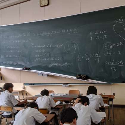基本と応用に分かれて授業を行っています。前回の続きで難関私立入試問題にチャレンジしています。応用コースでは、内容的には高校1年の数学でよく出てくる問題で、解き方を解説するとスラスラと解いていました。さすが飲み込みが早いですね。
