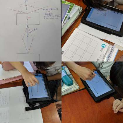 八阪中学校では、授業力向上のために研究授業をおこなっています。今日の6時間目に3年2組で理科の授業をしました。力のつり合い、力の合力を求める単元です。導入では、籠いっぱいに入った本を一人で持つとき、どの角度で持つのが持ちやすいのか、二人で持つときは近づくのと離れるのではどっちが重いのかを比べていました。授業の中で力の合力の説明があり、合力を作図していました。ほとんどの生徒が平行四辺形を作図することができていました。その後、二人で一台のタブレットを使用して練習問題をしていました。タブレットの不具合で線が引けないという場面もありましたが、みんな学習の内容を理解して取り組んでいました。