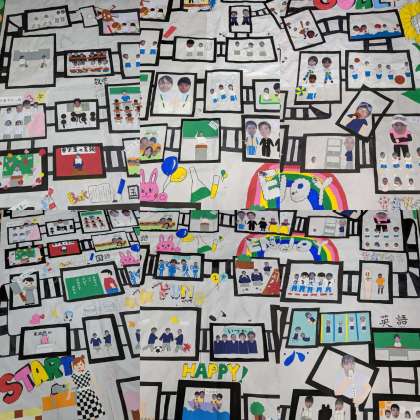 アニメーションの元になる3年間のマップを図書室に展示しています。図書館の絨毯になっています。ぜひ見に来てください。