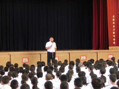 校長先生の講話の前に、「プレゼン八阪」でおこなわれた「学級旗(体育大会時につくった旗)選手権」の表彰がおこなわれました。優秀賞は1年1組、2年2組、3年3組です。学級旗はクラスの団結の象徴です。表彰される姿が誇らしげでした。それぞれのクラスの学級旗のようすは「プレゼン八阪」のホームページ記事(こちら)をご覧ください。