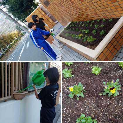 今週植えたばかりの花壇のお花が枯れないように、生徒会役員を中心に有志で活動している園芸サークルのメンバーが3連休、部活動の合間にお花の水やりをしてくれています。パンジーが少しだけ花開いてきました。花壇いっぱいにお花が咲き誇る日を楽しみにしています。