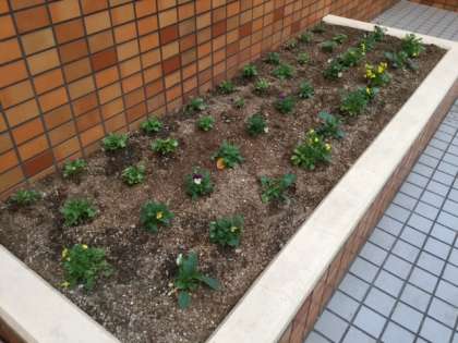 先週、10月31日に学校元気アップ支援事業のグリーンボランティアさんにお手伝いいただき花苗の植えつけをおこないました。パンジー・ビオラ・ノースポールです。しかし、急に冷え込みがきつくなったためか---それとも水をあげすぎたのか---成育が芳しくない苗があります。毎日気がかりでなりません。