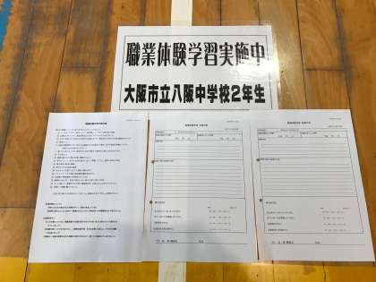 全体の諸注意の後、説明プリント、「職場体験実施中」のプレート等をもらい、各事業所ごとの諸注意です。