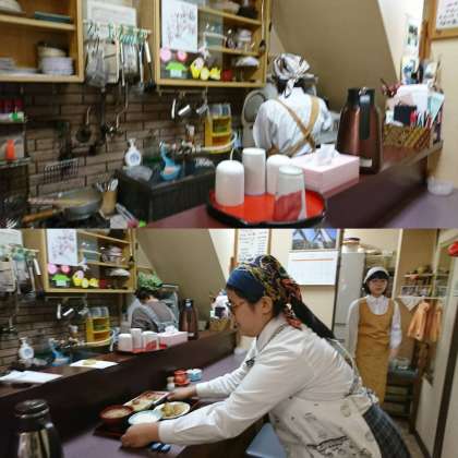 家庭料理 英(はなぶさ)では2名の女子がランチの配膳作業や片付けの手伝いをしていました。エプロンと三角巾を身につけ、店員になりきっていました。
