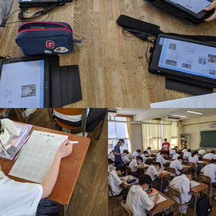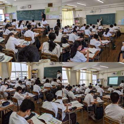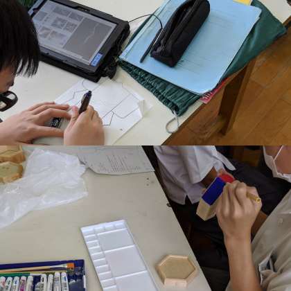技術科ではタブレットを使用して自己紹介の画像を作っていました。(3年4組)数学科はスーパー魔法陣をひとりひとりが解いていました。本来ならグループワークで友達の意見を聞いたりする授業です。(1年1組)美術科はマルチボックスの作成で色を塗っていました。出来上がった生徒は着物デザインに取り掛かっていました。(3年2組)家庭科は幼児の生活の授業でした。(3年3組)英語はmy birthday(1年2組)社会は下剋上の説明をしていました。応仁の乱?(2年1組)国語は小さな手袋という教材でした。(2年3組)暑い中マスク・フェイスシールドを付けての授業になります。生徒たちの負担にならないように先生も気を付けながら授業を進めていきます。