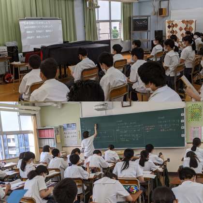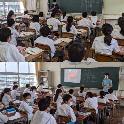 本日の授業の様子です。音楽科は音楽を聴いてどんなイメージを持つかをテーマにしていました。同じ感性を持った生徒が多いクラスでした。(1年2組)数学科は多項式の計算をしていました。(2年1組)国語科は「オオカミの友達」の教材をしていました。(1年4組)理科は植物の導入で、毛虫とイモムシが成虫になると何になるのかを知らない生徒がほとんどでした。イモムシ⇒蝶々、毛虫⇒蛾ですよ。(1年3組)技術科はそれぞれがオリジナルの棚を作っていました。(2年4組)家庭科はミシンを使っての授業でした。(2年3組)