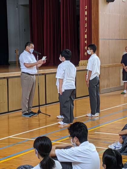 生徒専門委員の認証式がおこなわれました。各学年の男子学級代表が代表して、認証状を校長先生から受け取りました。今日の放課後に生徒専門委員会が開かれます。それぞれが学級の代表としてしっかり役割を果たしてくれればと思います。