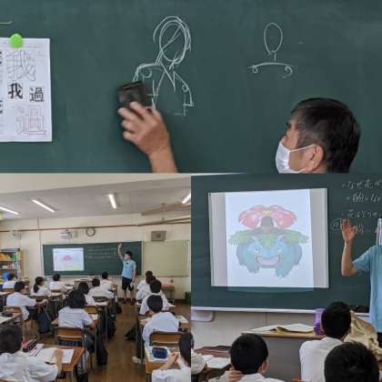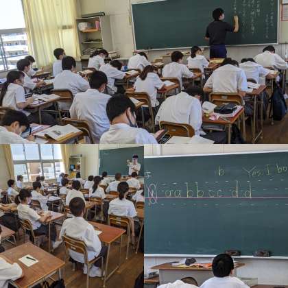 3時間目の授業の様子です。【国語】オオカミの友達という教材です。どんな内容なのでしょうか?(3組)【英語】アルファベットの大文字の小テストをしていました。その後は小文字を学習していました。(1組)【美術】デッサンの書き方の説明を聞いていました。(4組)【理科】植物の受粉の内容を学習していました。フシギバナが登場していました。どんな説明だったのでしょうか?(2組)