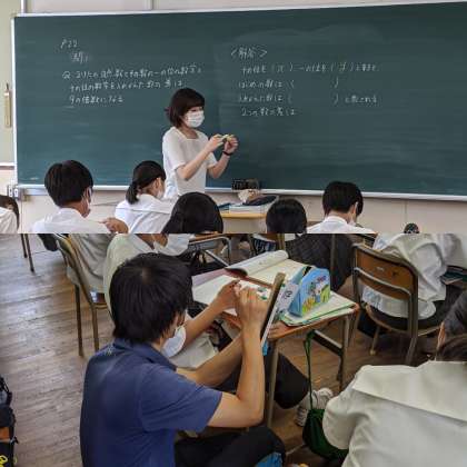 【数学】文字を使っての証明をしていました。2桁の数を文字を使うとどう表すのでしょうか?T.Tで授業をおこなっているので、わからない生徒がいるとすぐに先生が駆け付けますよ!(1組)
