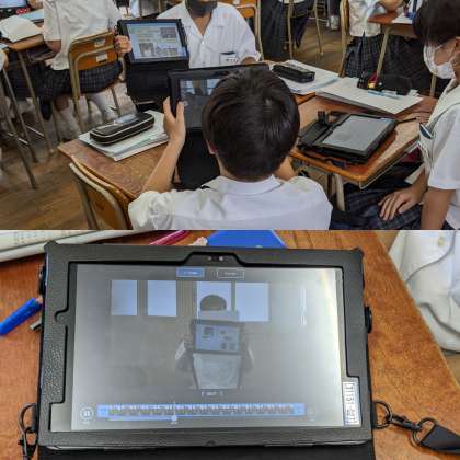 【技術】自己紹介文を作って発表していました。発表をしている姿を動画にとって見返して、よりよい発表になるように考えていました。(1組)