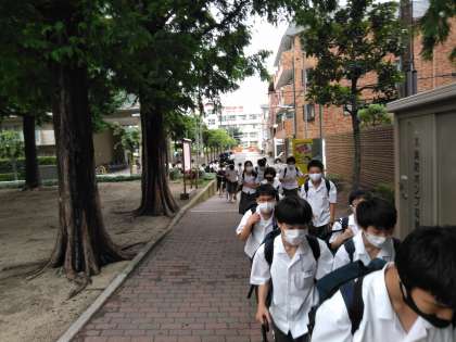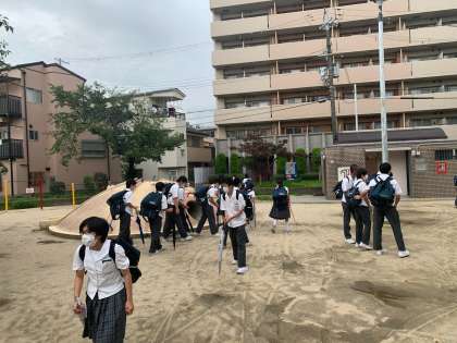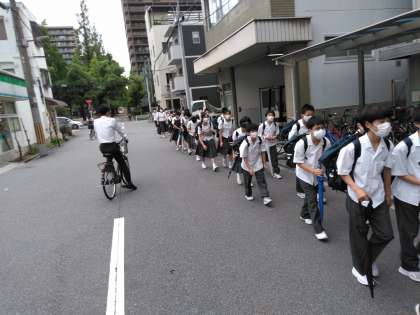 7月8日(水)6時間目に避難訓練を実施しました。各教室で、終学活中に地震速報が入るという設定でおこないました。机の下に頭を隠し、身の安全を確保する行動をとりました。その後、地域ごとに分かれて、各地域の避難場所まで実際に行きました。しっかりと避難行動がとれていました。