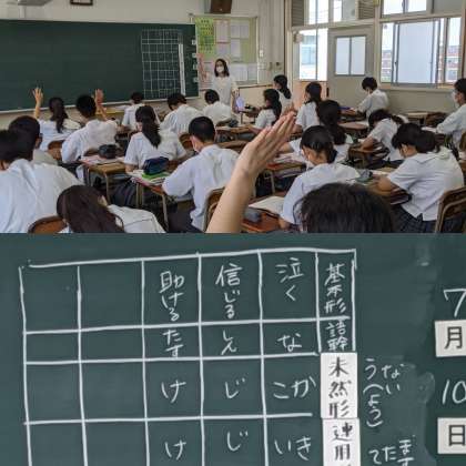 【国語】動詞の活用について学習していました。「この活用は何活用?」という質問にこどもたちは手をあげて発表していました。(1組)