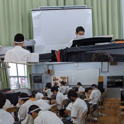 【音楽】リコーダーのテストがおこなわれていました。ピアノ伴奏を「あり」か「なし」か選択することができます。(1組)