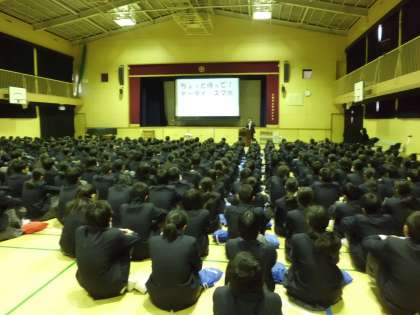 12月8日1限目に、兵庫県立大学准教授の竹内和雄先生と学生の下木さんを講師として招き、「ちょっと待って、ケータイ、スマホ」というテーマで情報モラル教育を実施しました。本校体育館は耐震工事で使用できなかったので、校区の鷺洲小学校の体育館をお借りして実施しました。朝早くからストーブの準備など、本当にお世話になり、ありがとうございました。