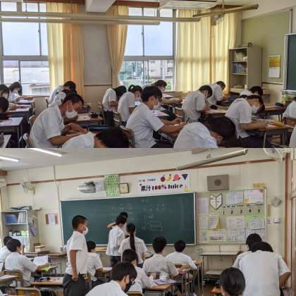 【国語】対義語の小テストをしていました。テスト明けで休んでいる暇はありませんよ。(2組)