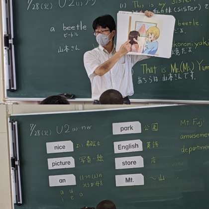 【英語】絵を見て質問に答えていました。単語の発音も大きな声で発声していました。(4組)