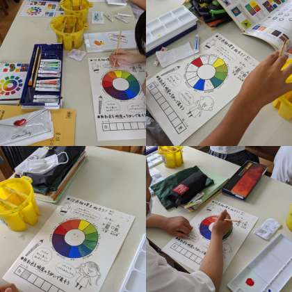 【美術】『12色相環をぬろう』3色の絵具を使って、色を作っていきます。分量を調整してうまく色をぬっていました。(1組)