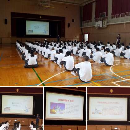 今日は、修学旅行の事前学習として平和学習を行いました。3年生は秋の修学旅行で長崎県を訪れる予定です。