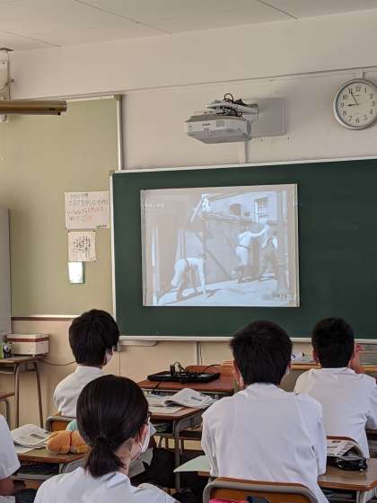 【社会】ドイツがナチス中心になっていく様子を映像で見ていました。チャップリンが出ていました。(1組)
