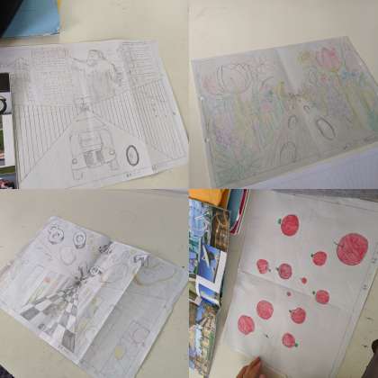 【美術】一点透視図法の下書きです。色鉛筆で色を塗り、本番は、色鮮やかに絵具で描いていきます。(1組)