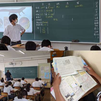 【理科】脊椎動物の分類でした。『呼吸』『体温』『子の増え方』『生息場所』色々分け方があると思いますがしっかり覚えましょう。(4組)