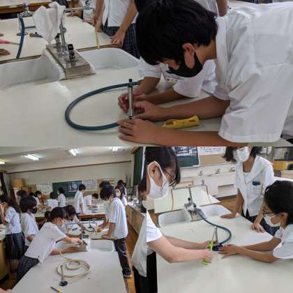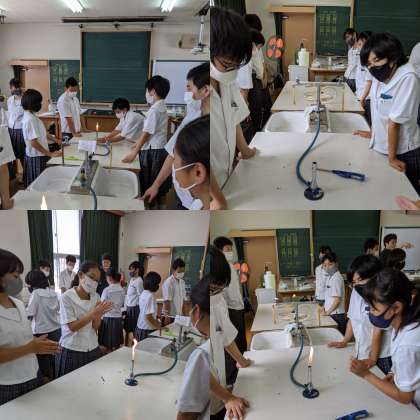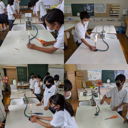 4時間目、理科の授業の様子です。ガスバーナーの使い方を学んでいました。火を恐る恐る点けている生徒、しっかりガスバーナーを持ち、ガスを出しながら火を点ける生徒など色々です。ガス・空気を調整して、『赤』『青』の炎を出していました。次の時間は、『ガスバーナーの使い方』のテストがあります。『ガス調節ねじ』『空気調節ねじ』がどっちかなどしっかり復習しておきましょう。ちなみにガス管に近い方が『ガス調節ねじ』です。まずガスを出さないと火は点きません。