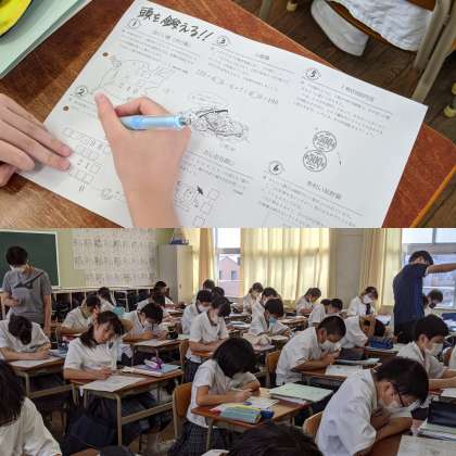 【数学】『頭を鍛える!!』のプリントをしていました。四角い頭をまるくしないと解けないですよ。発想力を高めていきましょう。(1組)