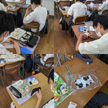 【家庭】マスクを作っていました。まち針で布を留め、器用になみ縫いをしていました。(4組)