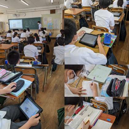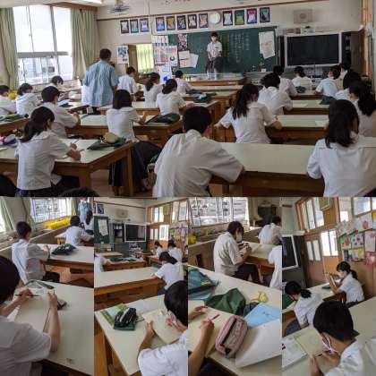 【技術】班に分かれて全員が発表していました。発表を聞いてメモを取り、終わった後は話し合っていました。(3組)