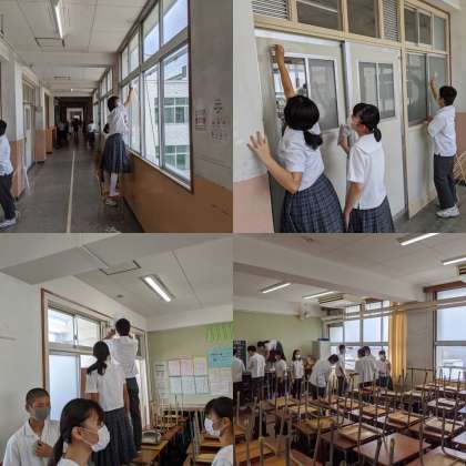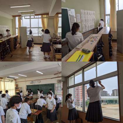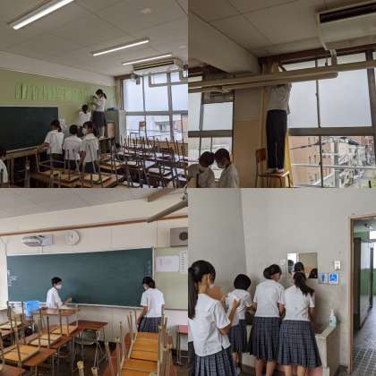 8月7日(金)の4時間目に大清掃をおこないました。窓を磨く、扇風機・エアコンのフィルターを外して洗う、カーテン・掲示物を外す、黒板をきれいにする、掃き掃除、拭き掃除、ロッカーや簀子などを移動させて隅まで掃除、壁を磨く、トイレ掃除、学校全体でそれぞれの役割の箇所で一生懸命清掃をおこなっていました。
