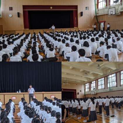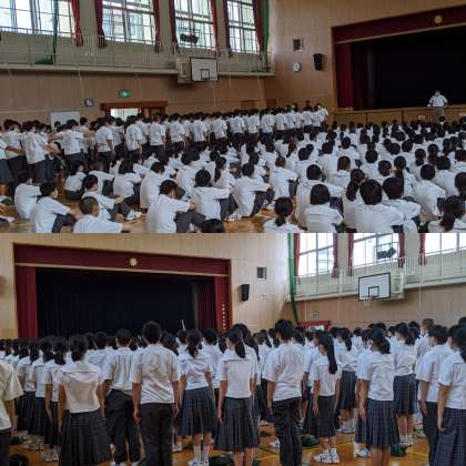 昼からの終業式は今まで経験したことがないです。短い1学期でしたが、大きな事故、事件がなくてよかったです。これだけ感染が広がっている中で、感染することなく1学期の最後を迎えられたことは良かったです。授業時間を取り戻すために、『土曜授業』『7時間授業』は2学期も続きます。気温が低くなることで、感染症がどのようになるか見当もつきません。みなさんは新しい生活習慣を身につけて感染しないように気を付けてください。また、3つの密を避けられ、ソーシャルディスタンスが保たれるときはマスクを外し、熱中症対策をしましょう。休みの間は自分で気を付けて行動できるようにして欲しいです。交通機関を利用するときはマスクを着用するようにしましょう。地域の一員、八阪中学校の生徒として、行動・言動には気を付けてください。特にSNSでの投稿には気をつけてください。海やプールなど水に入るときは危険な行動は避けて欲しいです。休みを無事に過ごして欲しいです。こういうときだからこそ時間を大事に使って過ごしてください。不安なことがあれば誰かに相談してください。何かあれば学校に連絡してください。こんなことが出来たと言えるような夏休みにしてください。8月25日に元気な姿で登校してきてください。