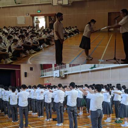 全校集会が行われました。最初に陸上部と水泳の表彰がありました。その後、教育実習生と大学との連携で来る先生の紹介がありました。担当クラス・教科は下記のとおりです。
