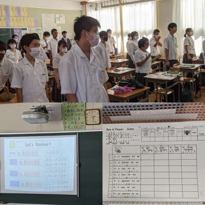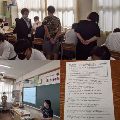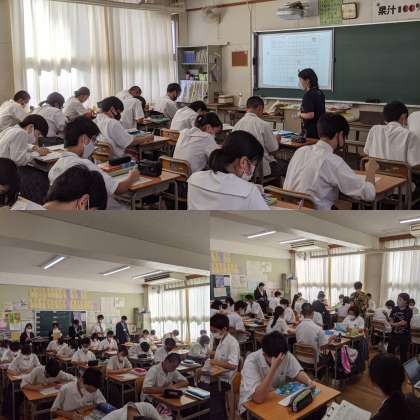 9月7日(月)英語の研究授業が4時間目3年1組、6時間目3年3組で行われました。(写真は3組)今年度、ICTを活用した研究授業をしています。最初に前回の復習を簡単にしていました。授業の流れに沿ったパワーポイントが次々に展開され、わかりやすくまとめられていました。英語の文を覚えるのに、ペアになってのワークシートを活用したゲームもありました。入試でもよく出る書き換えの問題の練習もしていました。最後に本時のまとめのプリント、問題プリントも配られ中身の濃い授業でした。