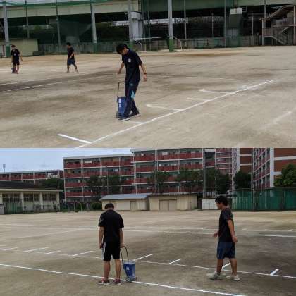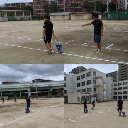 3時間目から始まる体育大会の練習の準備を体育の先生がしています。教育実習生もラインの引き方のコツを教えてもらいながら引いていました。