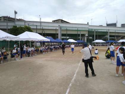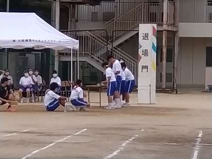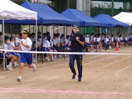 体育大会の大定番『借り物競争』です。どんなお題が出るかドキドキです。競技に出ている生徒だけでなく、会場全体に緊張感が走ります。抽象的な表現の『イカシテル』『やさしい』『かっこいい』『かわいい』先生は果たして正解だったのでしょうか。3年男子は色違いのタイヤを引っ張りゴールに向かいます。多くの先生が生徒と一緒に走ります。今年は手をつないでのゴールではなく、ソーシャルディスタンスを保ったままゴールです。やっぱりこの競技はほっこりしますね。会場も大盛りあがり!