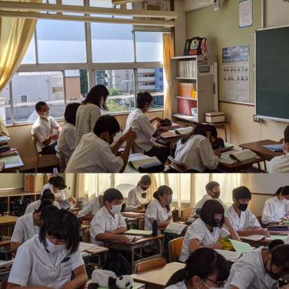 【国語】『枕草子』の暗唱テストをしていました。一人一人テストで、待っている間、暗唱の確認をしていました。(1組)