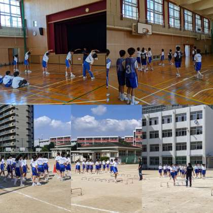 【体育】男子はラジオ体操のテストをしていました。待っている時間にバスケットボールをしたいました。女子はハードルの前の練習をしていました。(3、4組)
