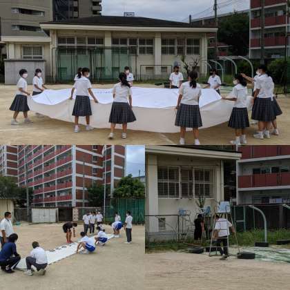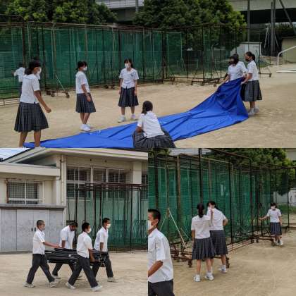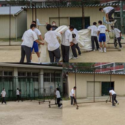 体育大会のときに使用した濡れたテントを干していましたが、雲行きが怪しくなってきたので、急遽、野球部とバドミントン部の生徒が昼休みに片付けをしてくれました。あっという間に片づけも終わりました。ありがとうございました。