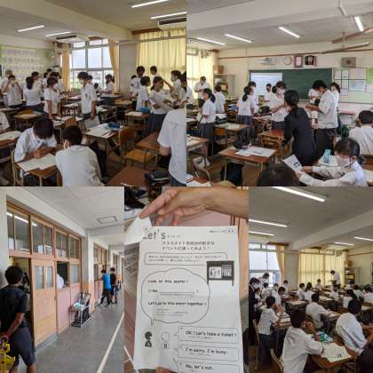 【英語】教育実習生の研究授業がおこなわれました。多くの先生が見に来ていました。ペアワークで活動していました。(3組)