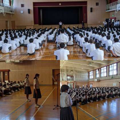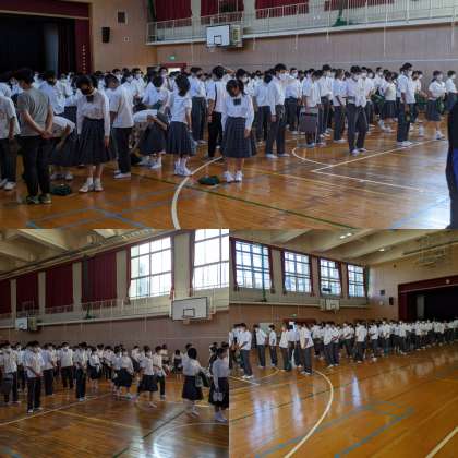 9月28日(月)の全校集会の様子です。最初に陸上部の表彰がありました。