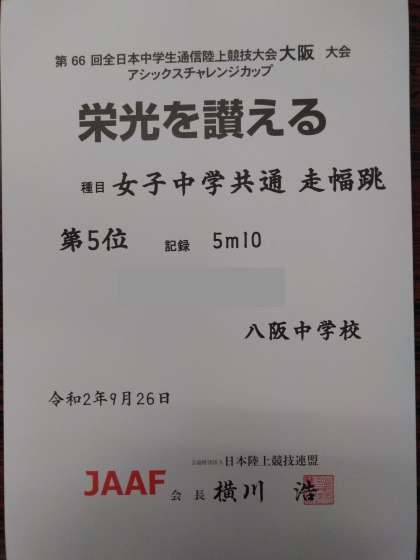 9月26、27日に全日本中学生通信陸上競技大会大阪大会が万博記念陸上競技場で行われ、本校からは3種目に出場しました。女子走り幅跳びでは、接戦の末第5位に入賞しました。あとの2種目もベスト記録を更新することができました。つぎはいよいよ大阪府総体です。暑い夏に頑張ってためてきた力を存分に発揮してほしいです。