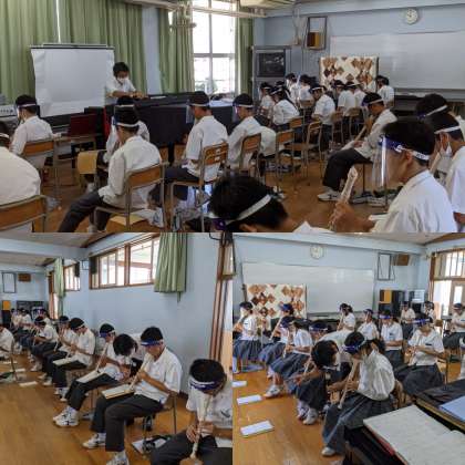 【音楽】リコーダーで『ドレミファソラシド』の練習をしていました。高い音が出にくい生徒は個人的に教わります。(3組)