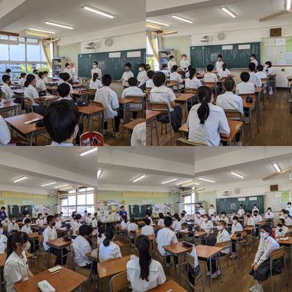 本日、前期最後の生徒議会がおこなわれました。最後に各学年、各専門委員の代表1名と生徒会全員から話がありました。緊張しながら話を進めていました。言葉が飛んでしまった場面もありましたが、みんな温かく見守っていました。生徒議会での経験を力にして成長していって欲しいと思います。